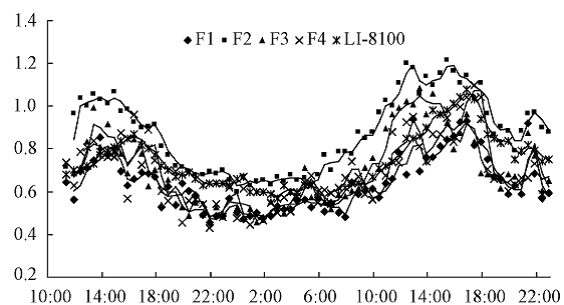 圖b RR-7330測(cè)量系統(tǒng)四個(gè)通道測(cè)量的土壤呼吸與li-8100測(cè)量日變化對(duì)比(中國(guó)林科院,高峻,2011)